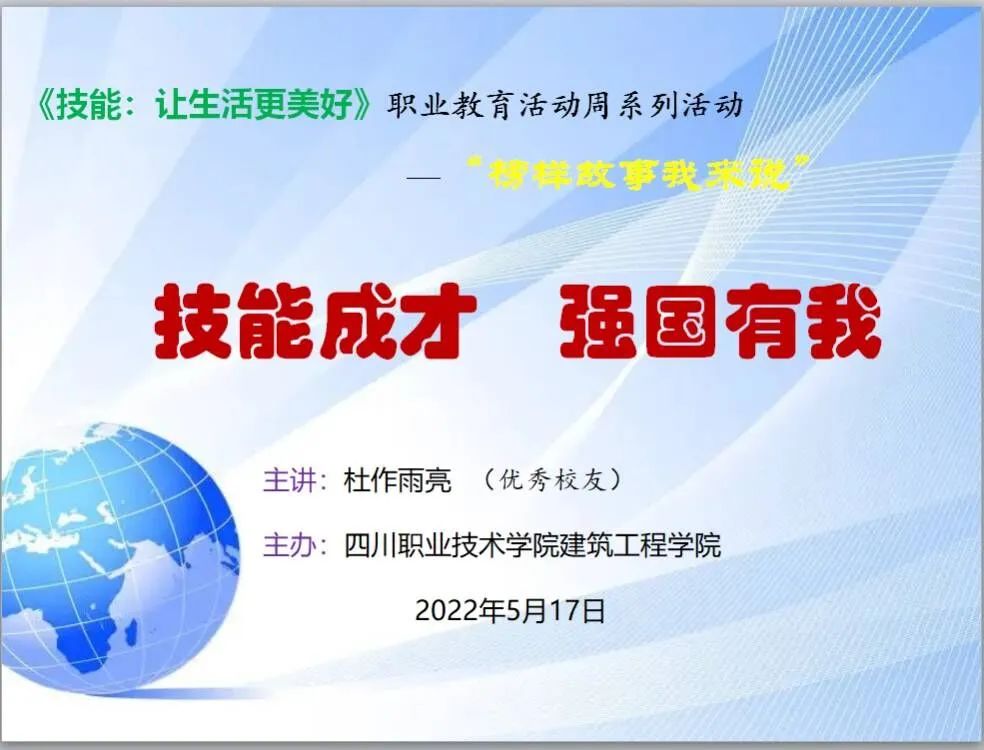為深入學習貫徹習近平總書記關于職業教育的重要指示精神和全國職業教育大會精神,大力宣傳勞模精神、勞動精神、工匠精神,弘揚勞動光榮、技能寶貴、創造偉大的時代風尚,根據《四川省教育廳等十部門關于做好2022年成渝地區雙城經濟圈職業教育活動周相關工作的通知》(川教函〔2022〕217号)的要求,建築工程學院于2022年5月17日晚上7: 30在B109教室召開了職業教育活動周系列活動“技能成才,強國有我”專題報告會。2005級工程造價專業優秀校友,廣聯達建築課堂特邀講師、中鐵中建企業内訓講師杜作雨亮(粽子老師)為此次講座主講人。建築工程學院副院長季秋媛擔任主持,院長陳文建、何淑君、張宇紅、高麗及建築工程學院20級、21級的部分學生聆聽了此次報告會。