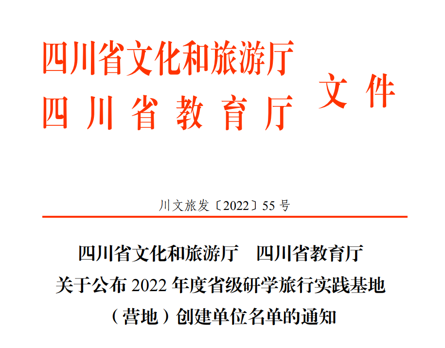 2022年8月9日,四川省文化和旅遊廳、四川省教育廳聯合發文《關于公布2022年度省級研學旅行實踐基地(營地)創建單位名單的通知》(川文旅發〔2022〕55号),批準袁隆平雜交水稻科技館等75個單位為2022年度省級研學旅行實踐基地創建單位,當代少年成都新津安西勞動研學旅行實踐營地等30個單位為2022年度省級研學旅行實踐營地創建單位。我校成功獲批為2022年度省級研學旅行實踐基地創建單位。