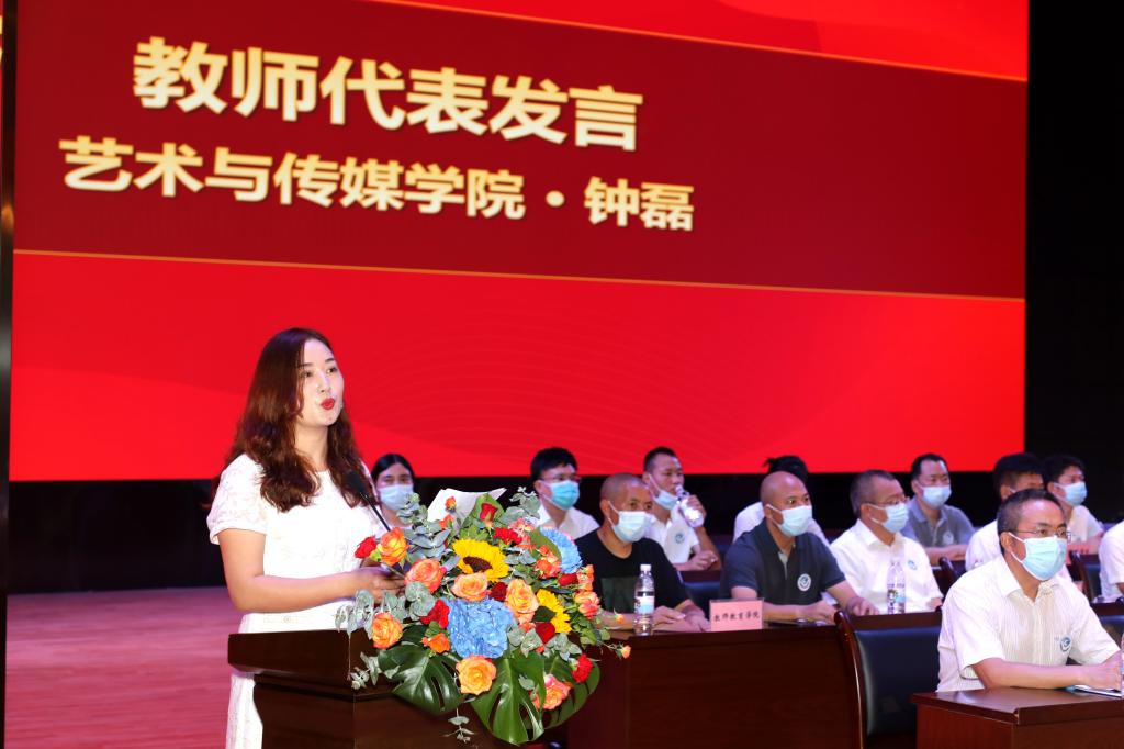 藝術傳媒學院教師鐘磊代表全體教師衷心祝賀畢業生順利完成大學學業,對他們的光明前途表示誠摯祝福,同時也表達了希望同學們在此後的新征程裡要銳意進取、勇擔使命的殷切期望。
